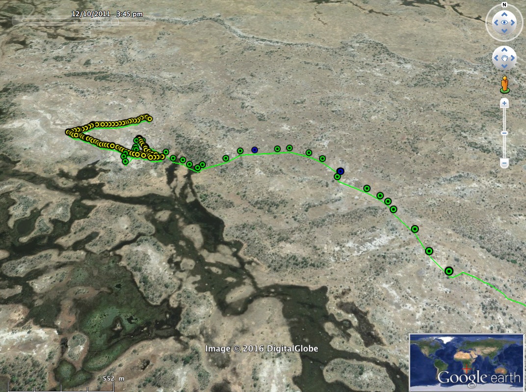 Wilson, A. M., et al. (2013) nous proposent un exemple de leurs données GPS en tant qu fichier Google Earth dans la Supplementary File 1 ( j’ai du renommer en .KML le fichier pour qu’il soit reconnu)