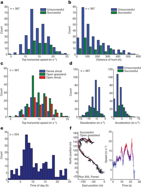 Successful hunts involved greater deceleration on average (−7.5 m s−2 versus −5.5 m s−2; P < 0.05; Fig. 4d), but there was no significant difference in peak acceleration (Fig. 4d), distance travelled (Fig. 4b) number of turns (6.7 versus 6.5) or total turn angle (347° versus 260°) (generalized linear mixed model (GLMM); Methods). This indicates that outcome was determined in the final stages of a hunt rather than hunts being abandoned early to save energy or reduce risk of injury, and the higher deceleration values may reflect actual prey capture. Wilson, A. M., et al. (2013)