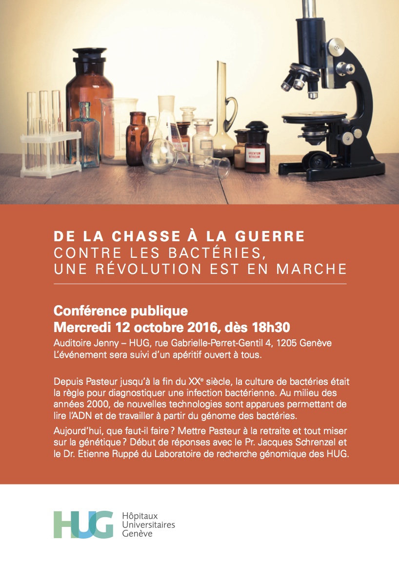 B) Une conférence bientôt par le Prof. Schrenzel et le Dr Ruppé » De la chasse à la guerre contre les bactéries, une révolution est en marche »
