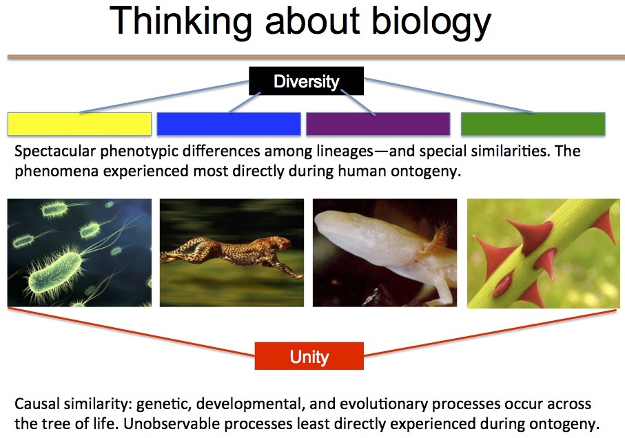 On observe facilement la diversité des écosystèmes, des espèces, des individus, on peut l’étudier au niveau physiologique, génétique et moléculaire, elle est manifeste dans tout le vivant – mais l’unité n’est manifeste que pour le biologiste.