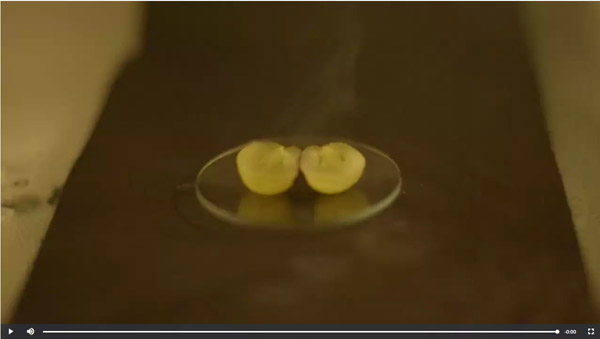 Fig 2: Les chercheurs montrent comment un four à micro-ondes produit un plasma avec un raisin coupé en deux. [img]. Source :Hamza K. Khattak